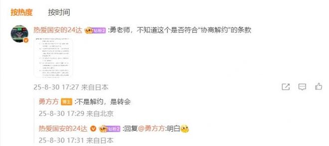 有网友提到了“协商解约”的条款,@勇方方 回复:“不是解约,是转会。”