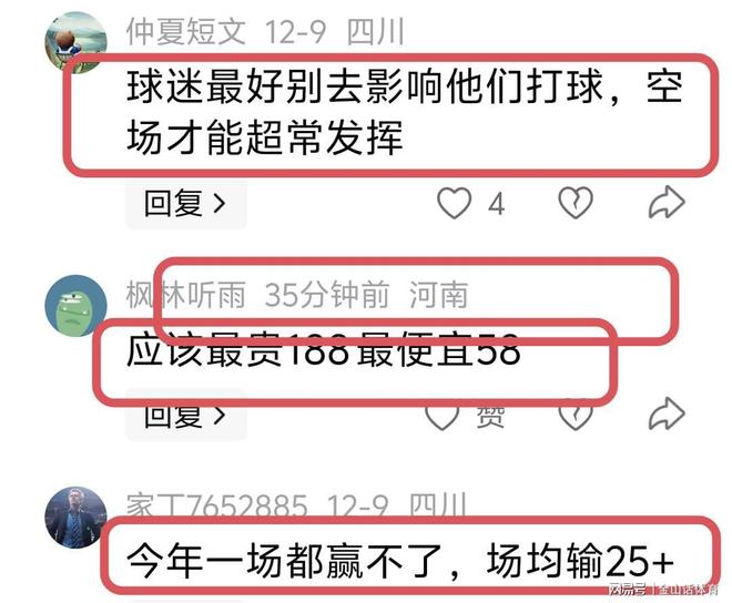 用“全华班”去打别人4节7人次外援球队,票价还不愿意“跳水”,球迷们也是怨声载道,纷纷吐槽道“免费请我看都不看,让这些人自娱自乐吧”;“球迷最好别去影响他们打球,空场才能超常发挥”;“应该最贵188 最便宜58”;“今年一场都赢不了,场均输25+”;“免费都不得去,没有意思”……