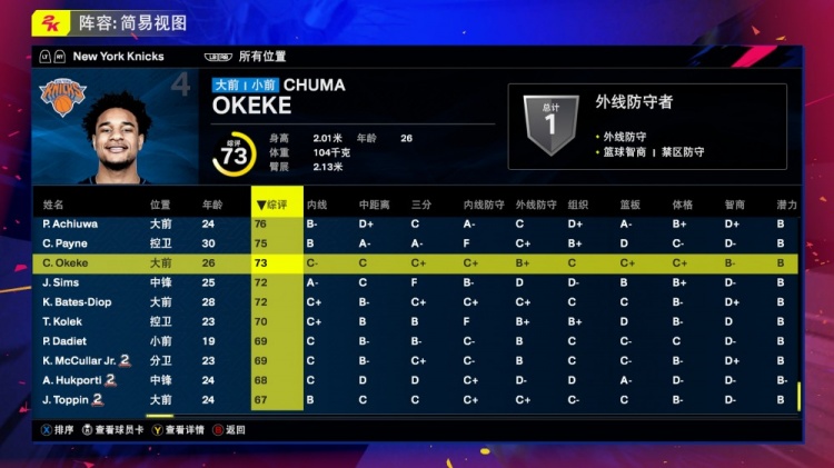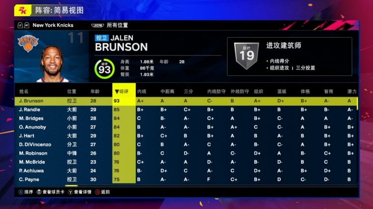 9月4日报道 NBA2K25今日正式发售,尼克斯全队能力值如下: