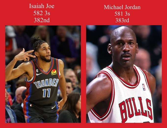 雷霆官方晒出数据:以赛亚-乔生涯飚进582个三分,超越乔丹(581),升至NBA历史第382位!