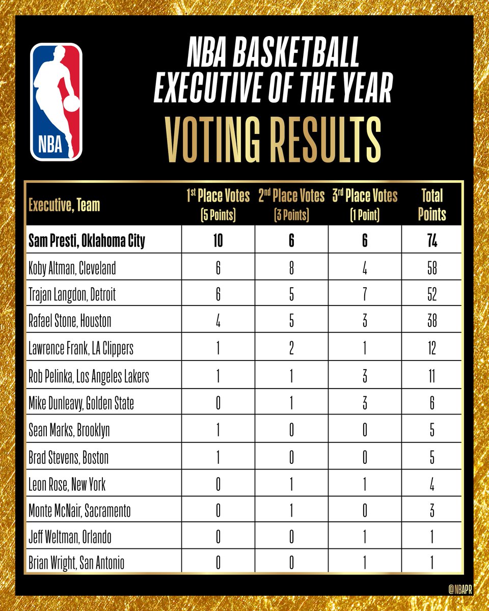 5月7日报道 今日,NBA官方宣布,雷霆总经理普雷斯蒂当选本赛季最佳高管。