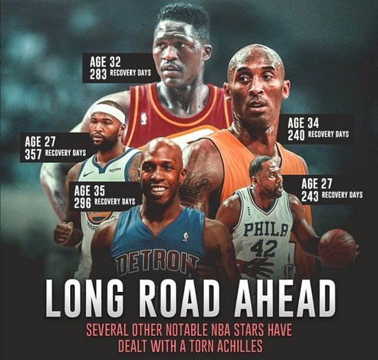 自从科比2013年春天那次英勇负伤导致能力断崖式下跌后,球迷们对“跟腱断裂”(Achilles tendon)这个词开始有种天然的恐惧:2012年的一份研究报告显示,之前20年共有18位NBA球员遭此不幸,其中7人退役,3人打一个赛季也宣告退场,即使努力在球场上挣扎,也不过是像科比一样的结局。