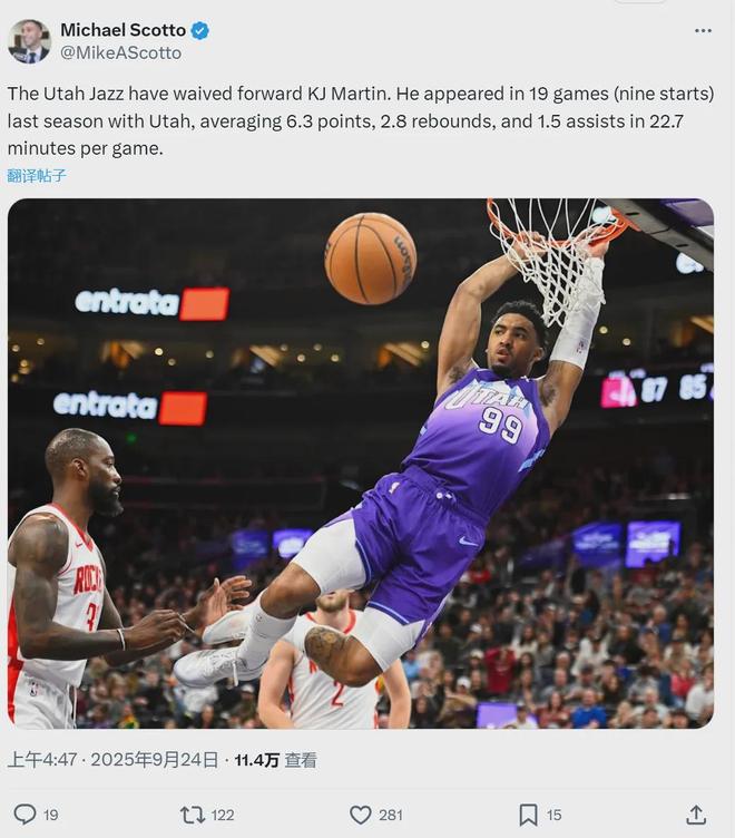 北京时间9月24日,据NBA记者Michael Scotto报道,犹他爵士队正式裁掉小肯扬-马丁,他将进入自由市场寻求新的机会。目前并没有球队表达出对小马丁的兴趣,他很难找到下家。小马丁原有合同还剩1年800万美元,完全无保障。