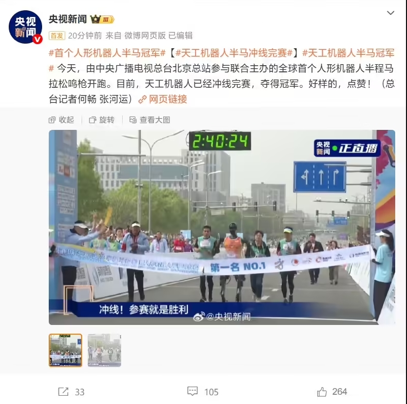 值得一提的是,在现场冲过终点线后,天工Ultra机器人像专业马拉松运动员一样降低速度,并受到现场媒体注目礼,这也意味着,全球首个人形机器人半程马拉松冠军来自中国智造。