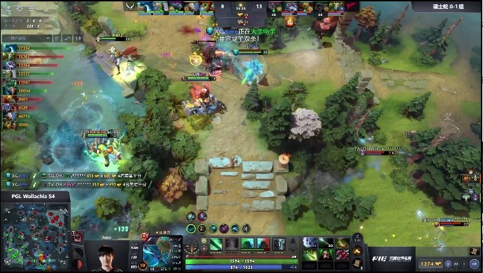 【27分钟】XG被破雾的瞬间,xxs马格纳斯跳上去弄到了Ws潮汐,潮汐开不出大招被秒,Ame水人进入乱杀模式,先踩大鱼人,再硬动手开着BKB的Natsumi先知,最后波到河道收割完成疯狂杀戮,将Talon直接打一波五人团灭,经济逆转。