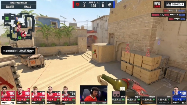 二加时第6局,MOUZ经济小炸枪械劣势,Spinx冲进B点沙发双杀,MOUZ18-18Spirit。
