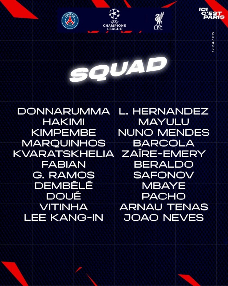 前锋:7-克瓦拉茨赫利亚、9-贡萨洛-拉莫斯、10-登贝莱、14-杜埃、19-李刚仁、29-巴尔科拉、49-姆巴耶