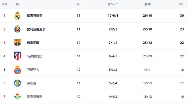 在积分榜上,皇马10胜1负的战绩太出色了,以30分高居榜首。比利亚雷亚尔7胜2平2负,拿到23分,排名第2。少赛一轮的巴萨只有22个积分,排名第3。马竞也是22分,净胜球落后,只能排名第4。西班牙人18分排名第5。第6的是赫塔费,拿到17分。