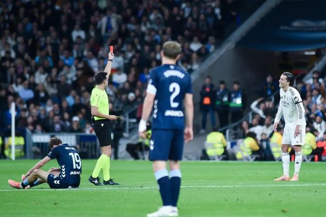卡雷拉斯被红牌罚下,皇马彻底没辙了。新华社发