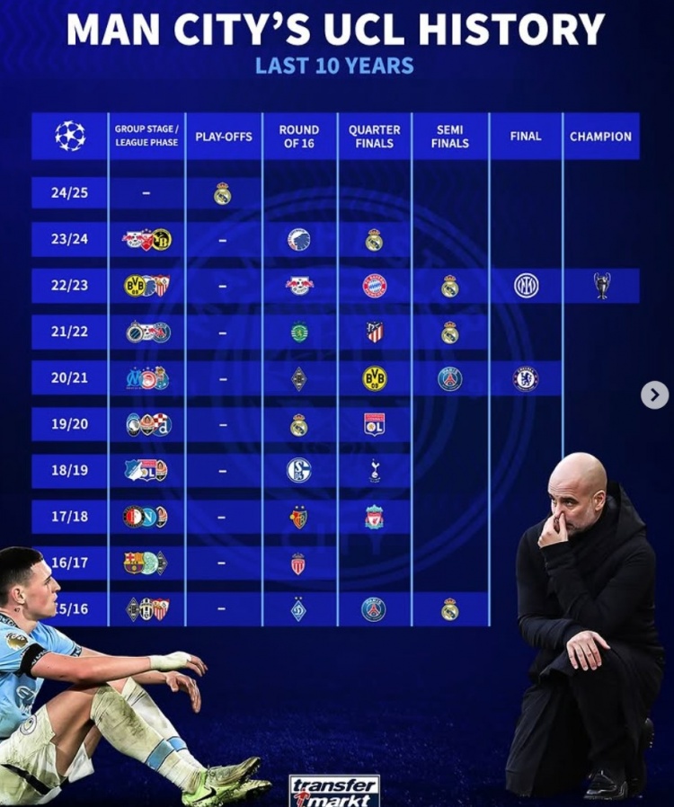 2月20日报道 曼城在本轮欧冠附加赛被皇马双杀淘汰出局,十年来首次无缘欧冠十六强战。《转会市场》也列出了曼城近10年欧冠战绩。