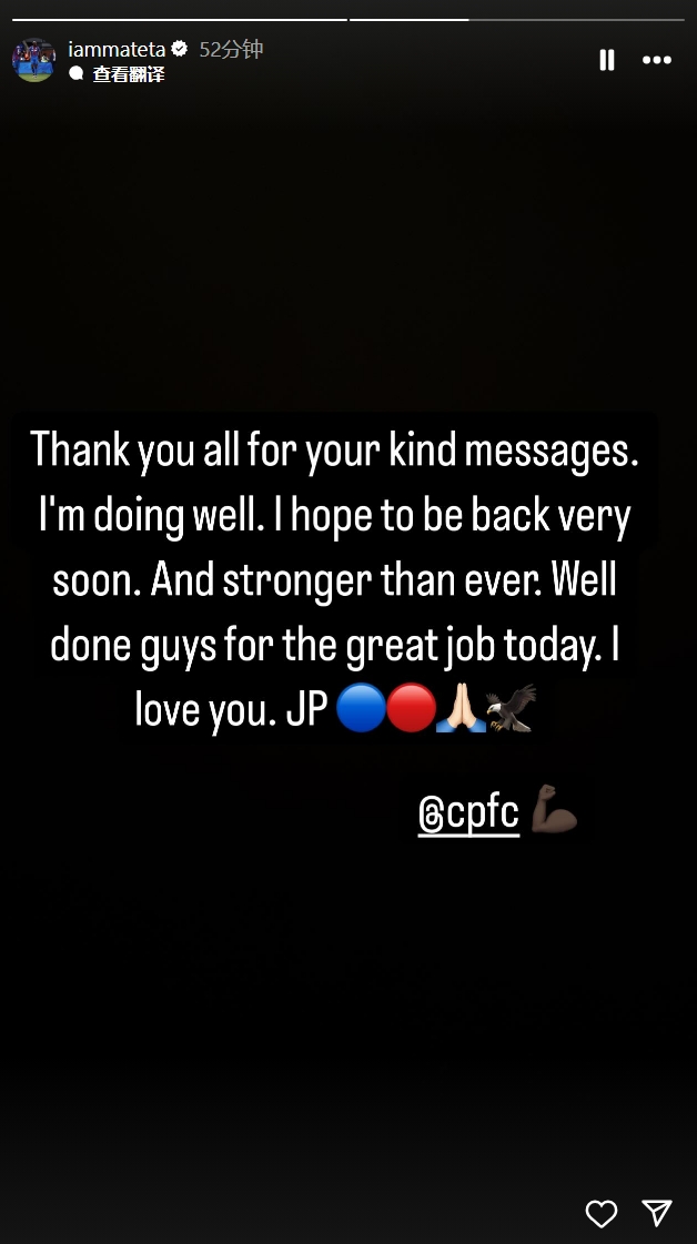 赛后马特塔在社媒发文报平安:“感谢大家充满温暖的消息,我现在感觉很好,希望很快就能回归,而且会是比以往任何时候都更强大的姿态,大家今天踢得很棒,我爱你们。”