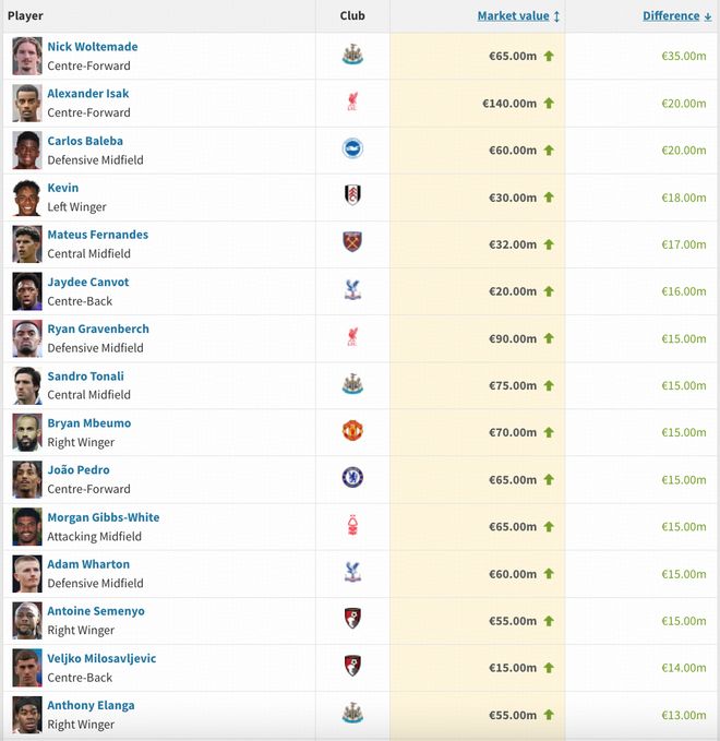 德转列英格兰球员身价TOP10:贝林厄姆1.6亿欧第1,埃泽上榜