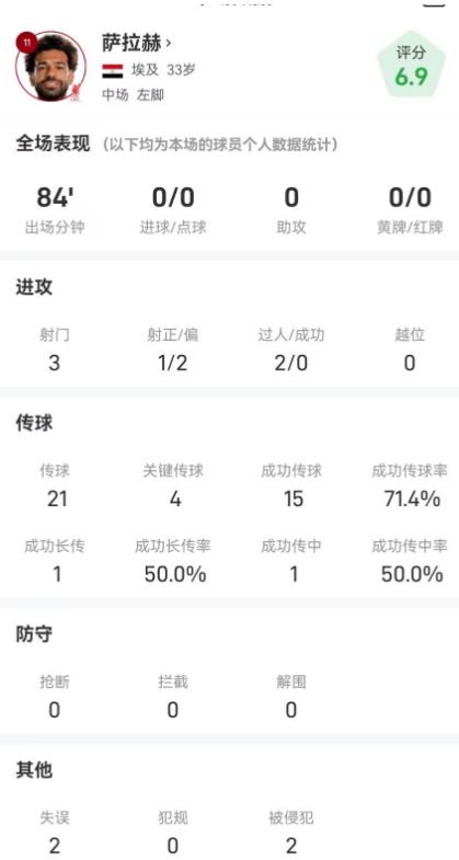 纵观全场比赛,萨拉赫出战84分钟,在场上有着3次打门,其中包括1次射正和2次射偏;他在场上2次尝试过人,却皆没能成功。